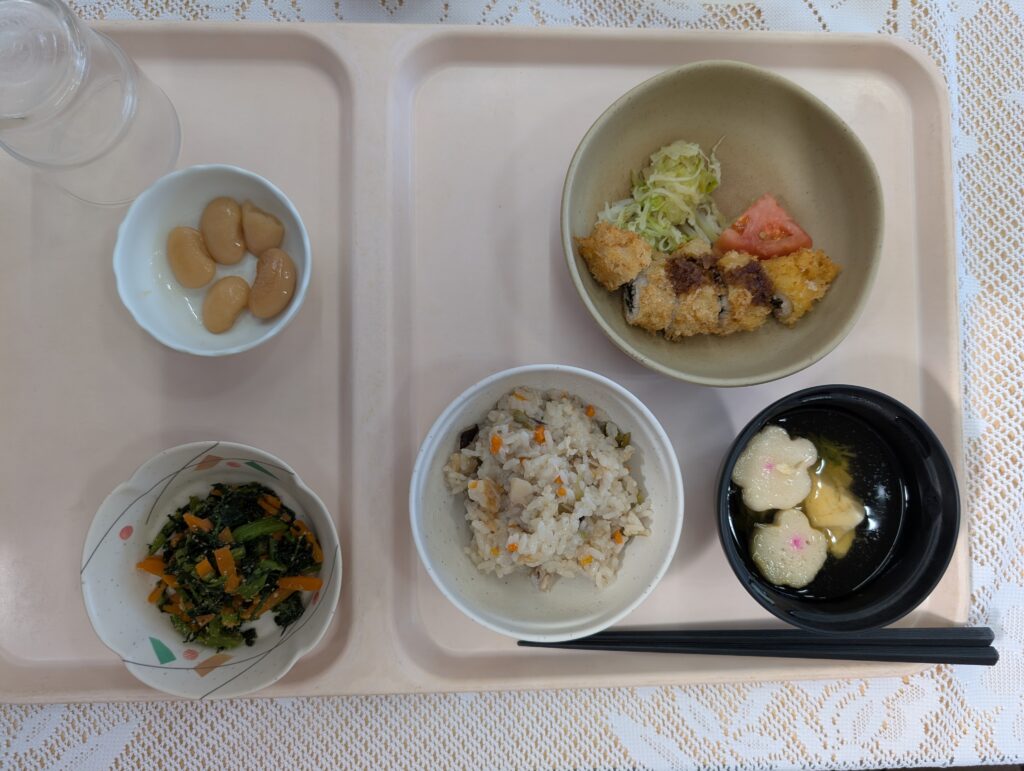 祝い膳は、きのこご飯 梅ロースかつ、春菊胡麻和え、煮豆、お吸い物とケーキでした。