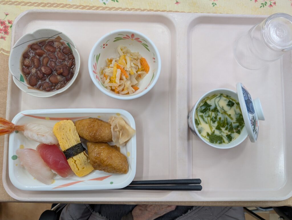祝い膳は、握り寿司、柿なます、茶わん蒸し、金時煮豆、でした。どれも美味しそうです。久々の握り寿司に皆さんのテンションが上がります!