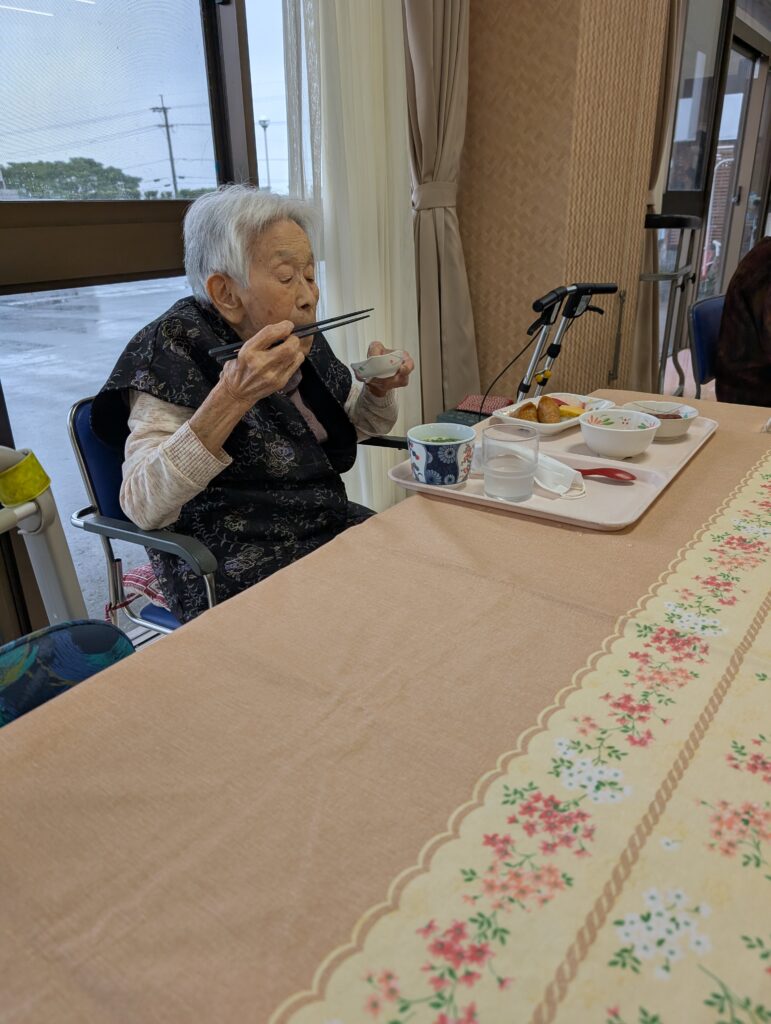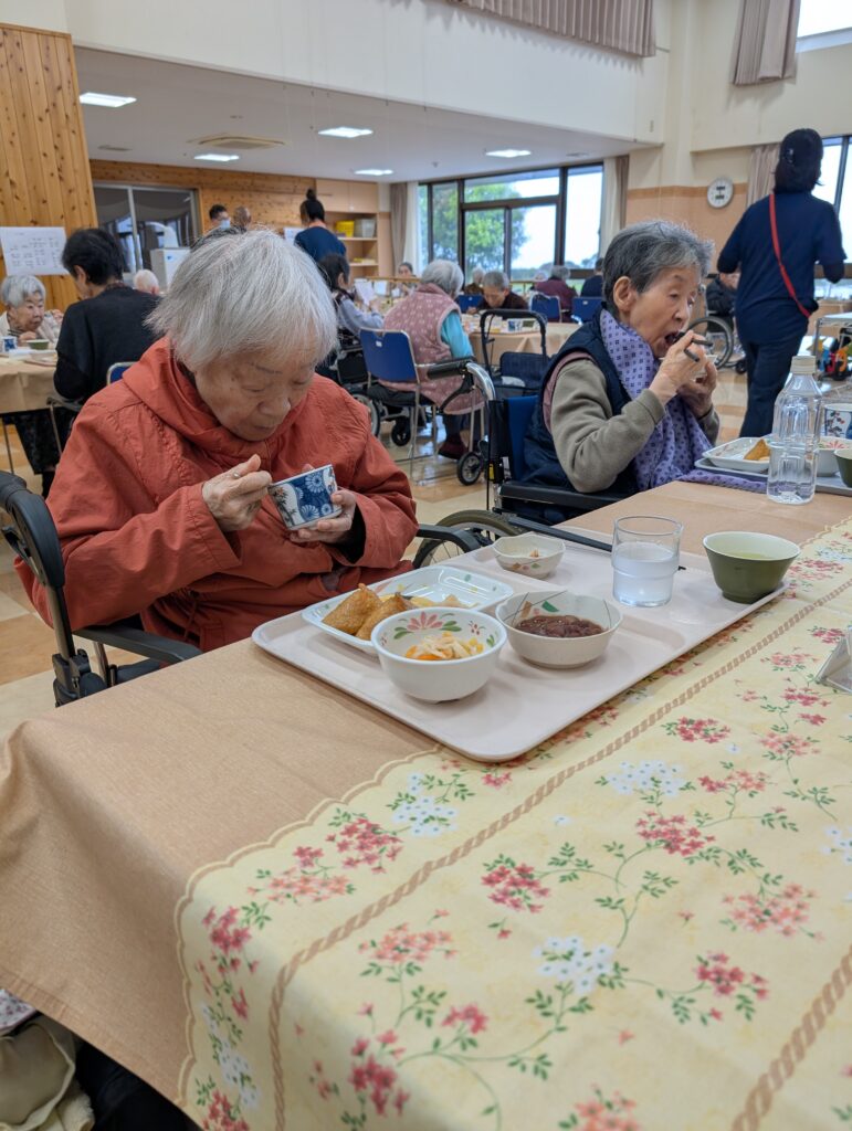 園内最高齢の利用者さんの元気な乾杯の発声とともに楽しい食事時間の始まりです。お寿司を皆さん真っ先に食べられていました。