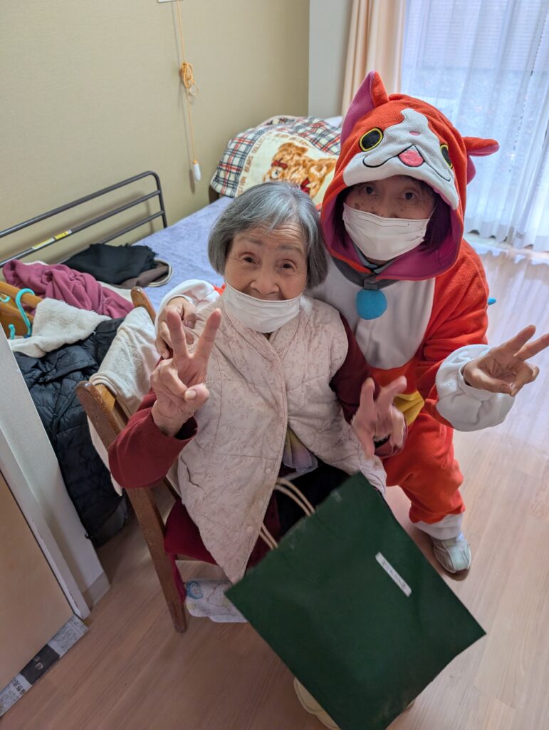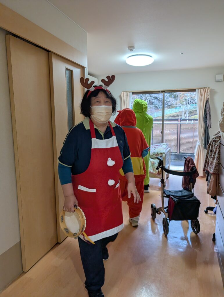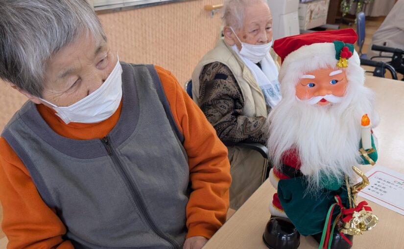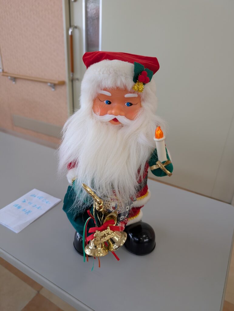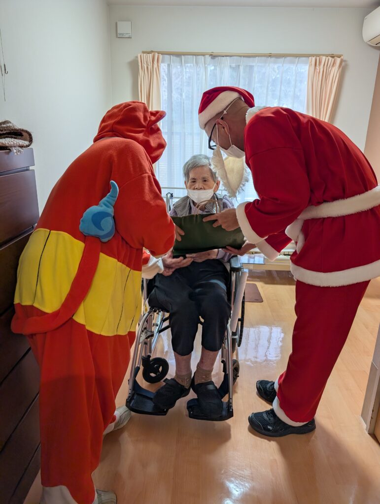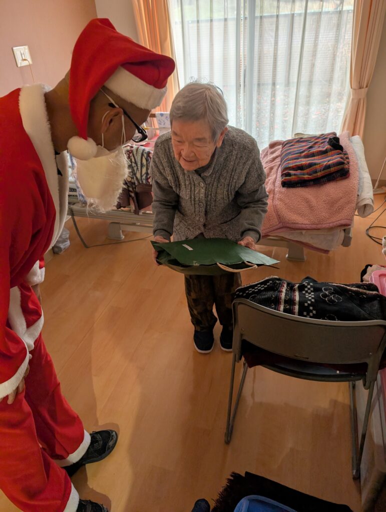 赤い衣装に身を包んだサンタが、お一人ずつの部屋を回ってプレゼントをお配りしました。サンタと握手を交わしたり、大切そうにプレゼントを抱えたりと、皆さん喜ばれていました。
