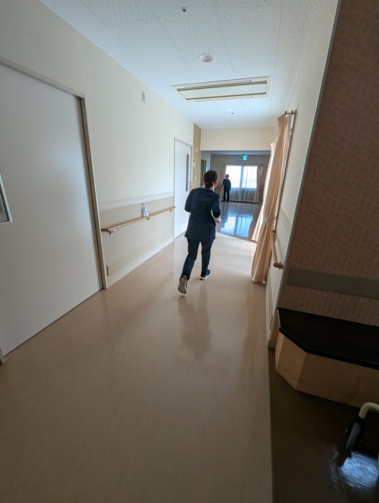 夜間の火災想定での訓練です。職員2人で利用者の方々を誘導します。