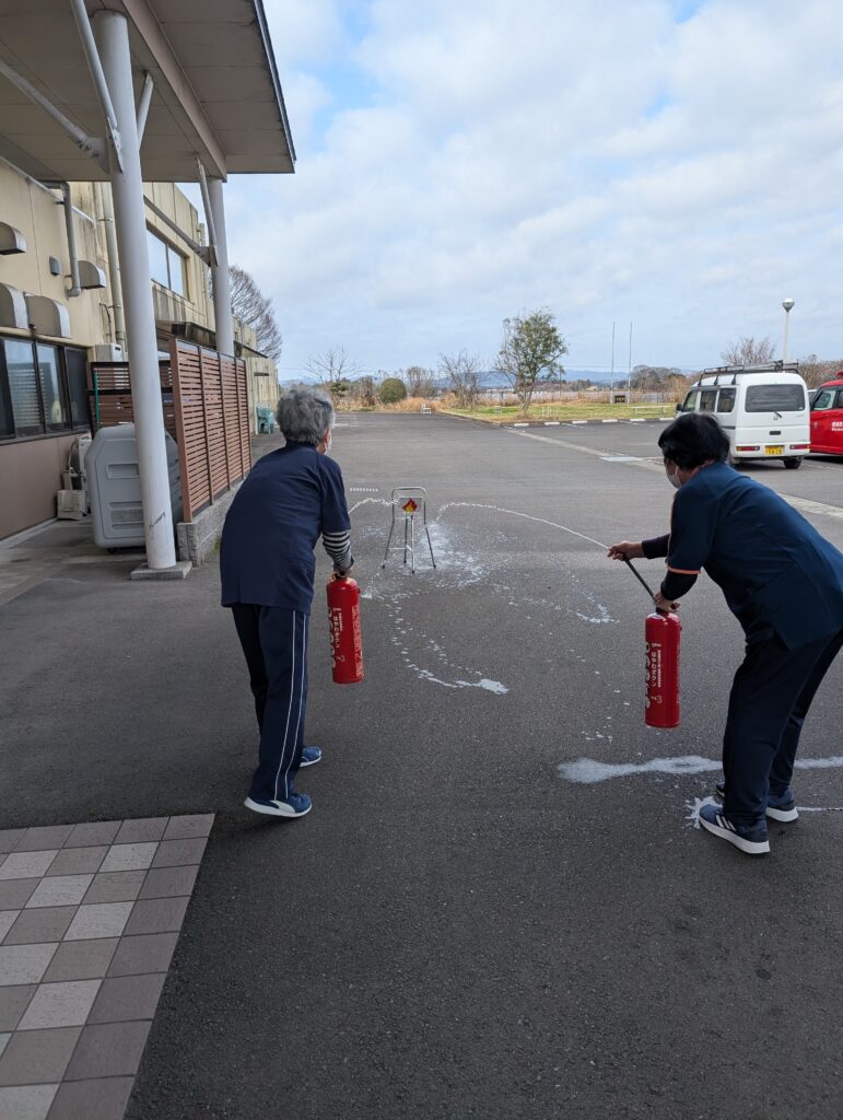 最後は職員の消火器訓練です。操作の仕方やホースの外し方などを教えて頂きました。