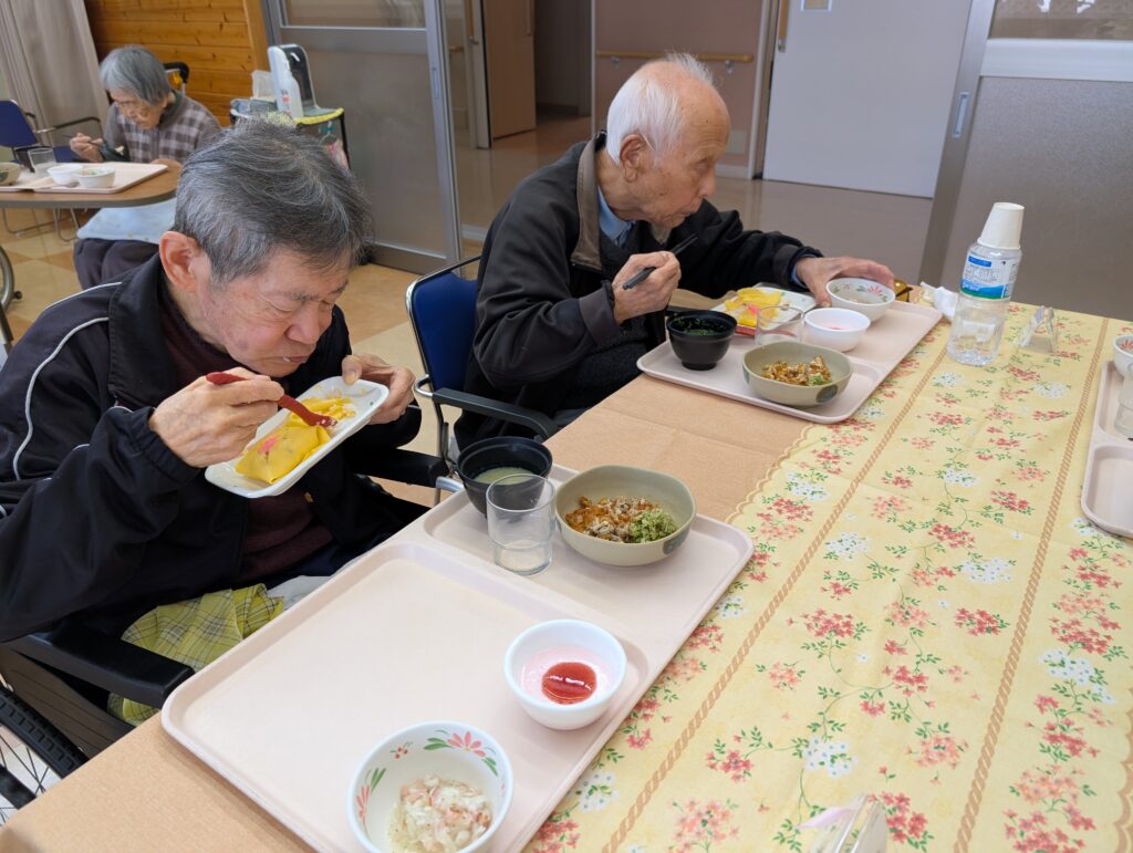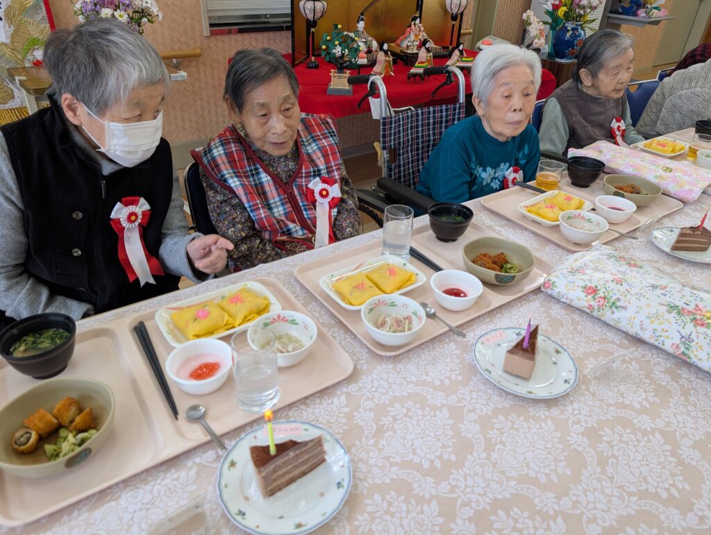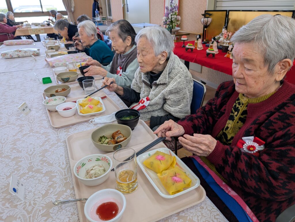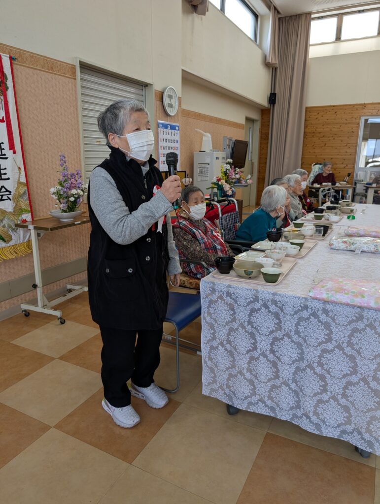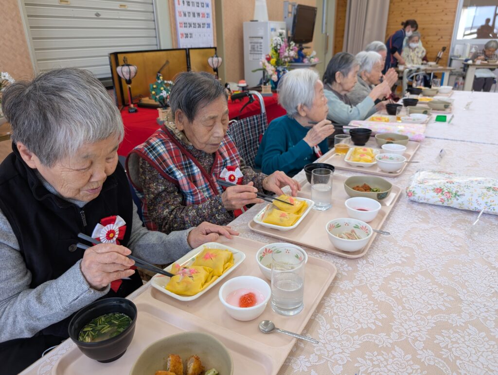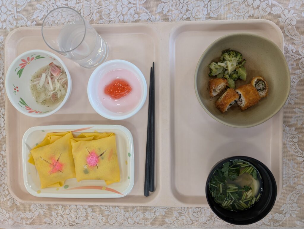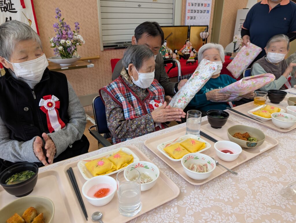 祝い膳は春らしく明るい色調のごちそうです。茶巾寿司、梅しそ巻き揚げ、新玉ねぎマリネ、すまし汁、ババロアでした。今回のお料理も手が込んでいて美味しそうです。皆さん「春がきたね~」「美味しいね~」と感想を言われていました。