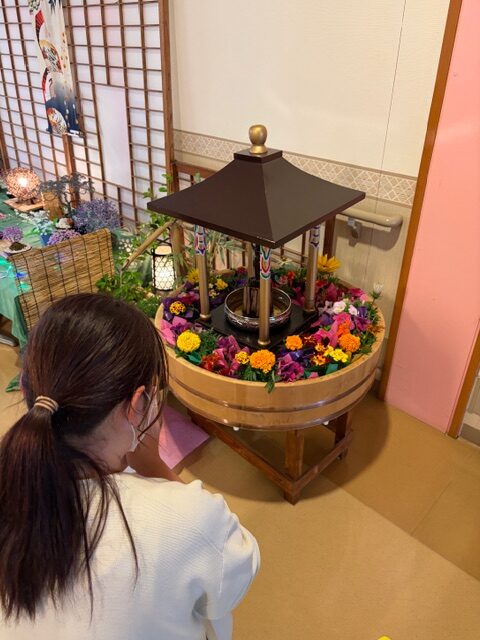 甘茶をかけ、手を合わせます。入居者様も手を合わせておられました。