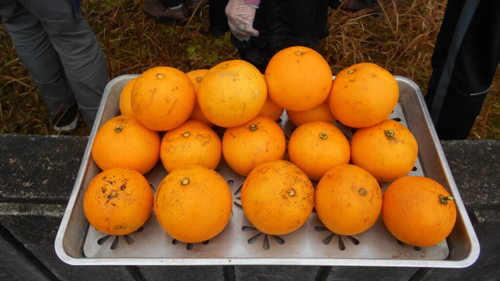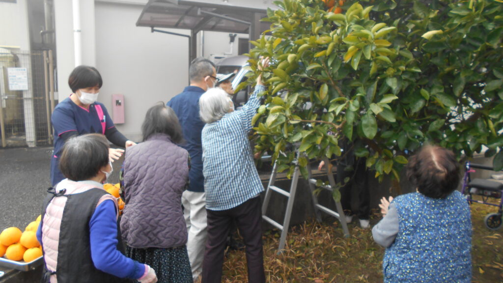 食堂前のはっさくは、今年は豊作でした。利用者の方は一生懸命とりかたがありました。